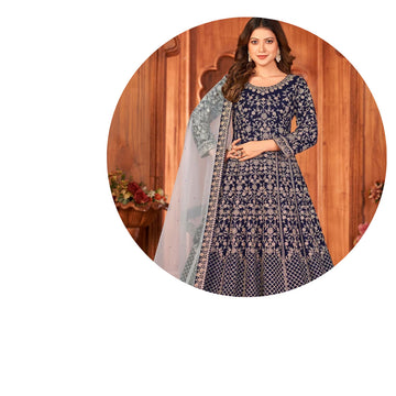 This stunning Blue Faux Georgette Anarkali Suit features intricate embroidery on both the front and...