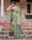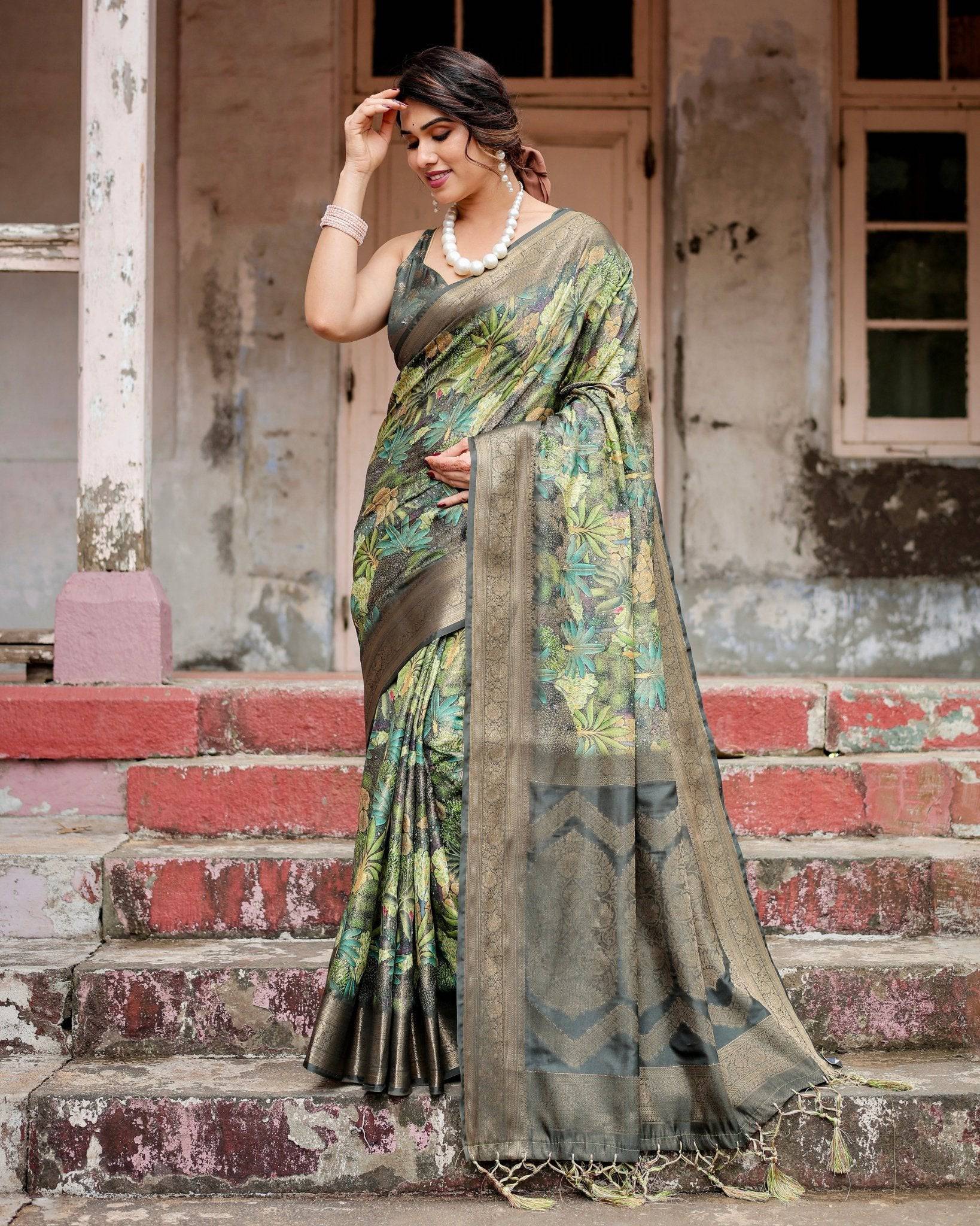 Green Banarasi Silk Saree with Lush Botanical Digital Print & Intricate Zari Border
