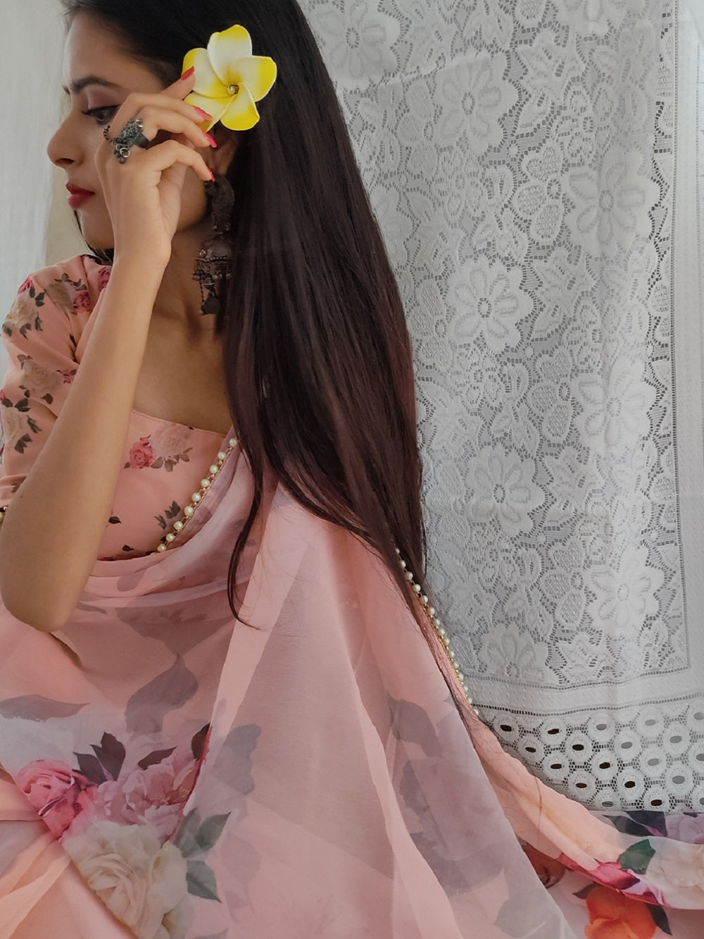 Peach Color Printed With Pearl Lace Border Georgette Saree